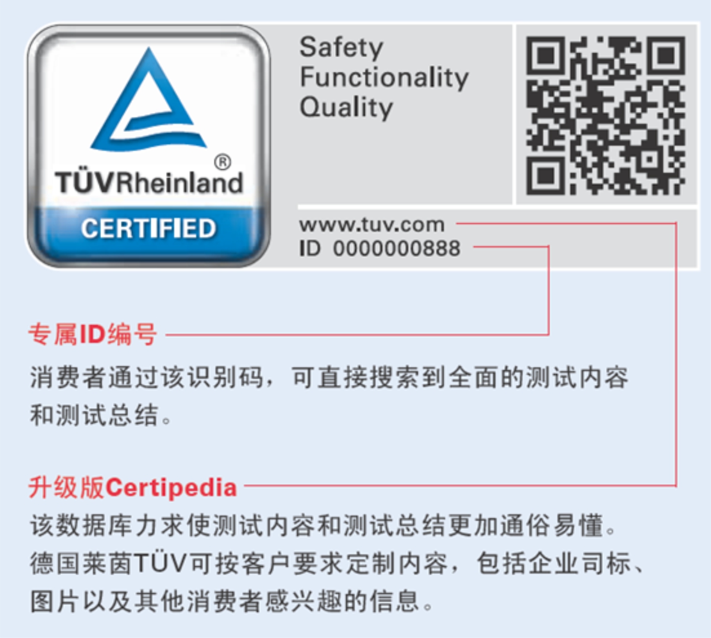 每位在德國萊茵TÜV申請GS、TÜV-MARK認證的客戶,在出證時都會建立一個專屬的ID編號,便于消費者能更直觀地認識到產(chǎn)品測試結(jié)果。