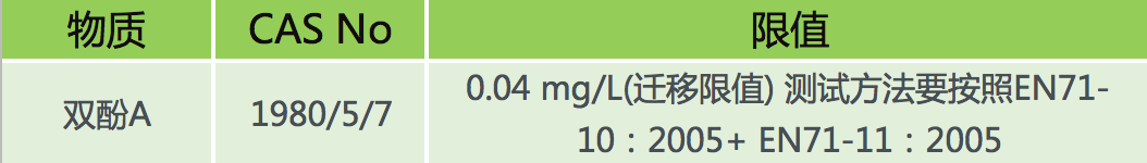 歐盟委員會在2017年5月24日發(fā)出新指令EU 2017/898修改玩具指令2009/48/EC雙酚A的遷移要求。針對3歲以下的兒童或者意圖放入嘴巴的玩具的雙酚A遷移量應(yīng)從0.1毫克每升降到0.04毫克每升。