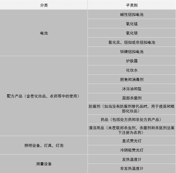 表2:汞添加產(chǎn)品的分類和子類別(從提議規(guī)則中提取部分供參考)