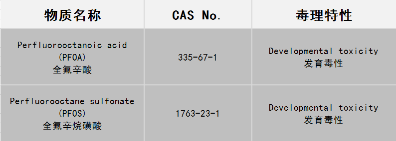 2017年11月9日,依據安全飲用水和有毒物質執行法案(加州65法案)的要求,環境健康危害評估辦公室(OEHHA)將全氟辛酸(PFOA)和全氟辛烷磺酸(PFOS)兩種導致生殖毒性的物質加入有毒化學物質清單。