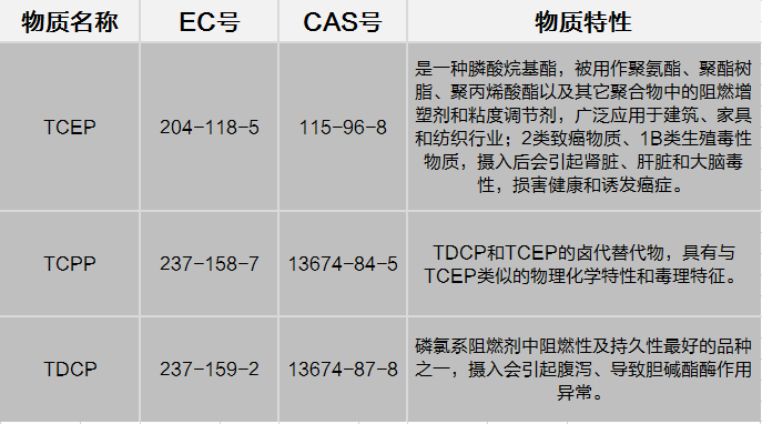 2017年12月13日,歐洲化學(xué)品管理局(ECHA)針對限制兒童保育產(chǎn)品和家具中的磷酸三氯乙酯(TCEP)、磷酸三氯丙酯(TCPP)、磷酸三(1,3-二氯-2-丙基)酯(TDCP)開展公眾評議,物質(zhì)的詳細(xì)信息見下表: