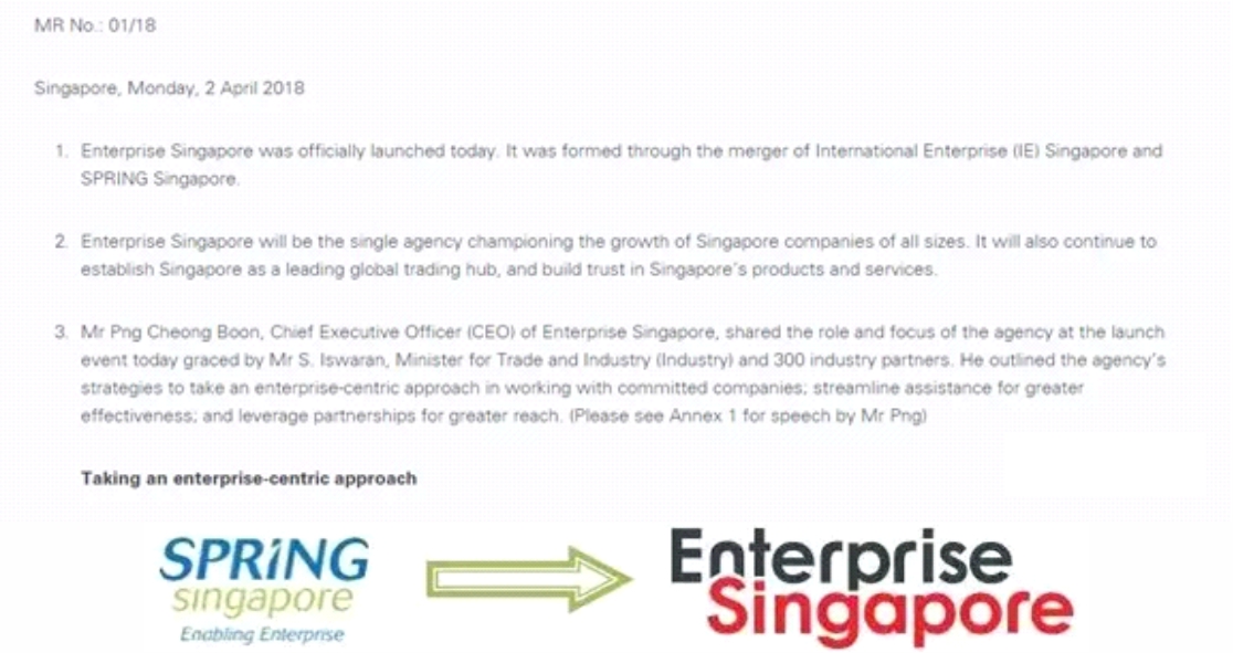 2018-4-2, 原新加坡認證監(jiān)管機構(gòu)SPRING Singapore經(jīng)過與新加坡國際企業(yè)發(fā)展局 International Enterprise (IE) Singapore重組合并后更名為Enterprise Singapore。
