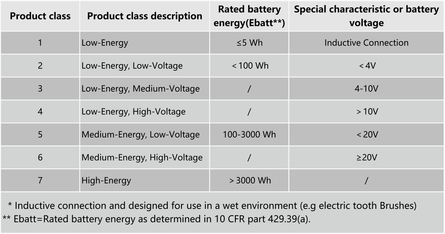 2018年6月13日后生產的電池充電器,必須符合小于或等于法規10 CFR 430.32(z) 中規定的最大單位能耗(UEC)的要求,該要求對7種不同類別的電池充電器分別設定年度能耗。充電器的UEC以電池能量(Ebatt)的函數表示,它反映的是在所有工作模式下所消耗的“無用”能量(即充電過程所消耗的但未傳輸至電池的能量數)。