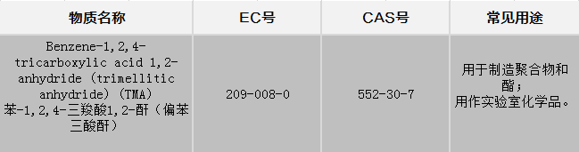 2018年4月19日,歐盟官方公報發(fā)布了決議(EU)No. 2018/594,確定苯-1,2,4-三羧酸1,2-酐(偏苯三酸酐)(TMA)為高度關(guān)注物質(zhì)(SVHC)。