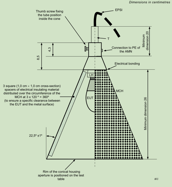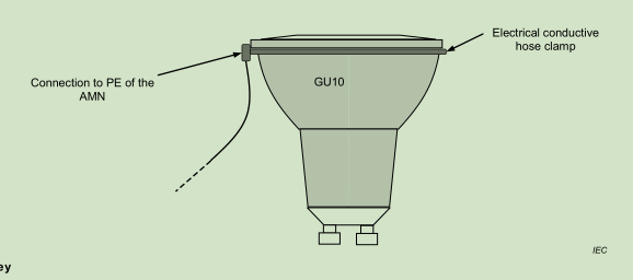 對于使用GU10燈頭的自鎮流燈,在進行傳導騷擾測試時,錐形罩或者燈頭本身必須要與人工電源網絡的地相連,如下方示意圖所示:![]() |