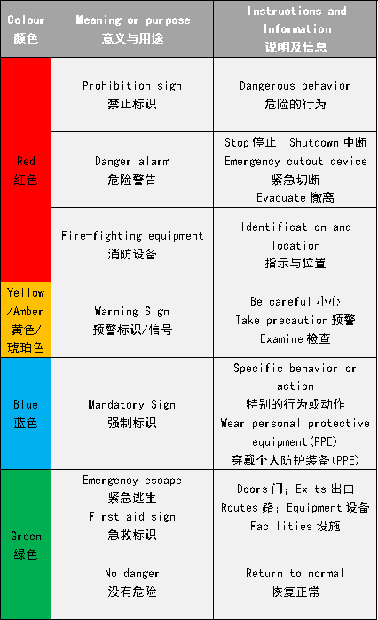讓我們先從歐洲市場的要求講起,歐洲在1989年就發布了一項法規指令(EEC) No.391,對工人在工作場所的安全與健康,提出要求和鼓勵提高措施。作為對No.391指令的落實,隨后的1992年,發布了一項法規指令(EEC).No.58, 對工作場所常見的安全與健康標志的提供提出了最低要求。在其中的附錄I (Annex I)中,對標記配套的顏色給出了詳細的說明,具體如下(附簡譯,有理解偏差以英文為準):