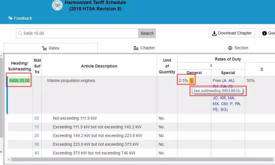 以在美國加征范圍內的稅“8408.10.00船用推進發(fā)動機”為例,這項產品被列入了第一批340億美元的加稅清單中,此前它的進口稅率在“General”處顯示的是2.5%。但是現在,它的“General”稅率后面跟著一個“1”,鼠標靠近后顯示“See subheading 9903.88.01”。