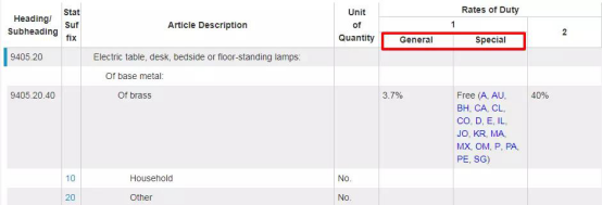 搜索頁面中的RatesofDuty1,左邊General為一般進口稅率,右邊Special是美國對特定國家征收的進口稅率。