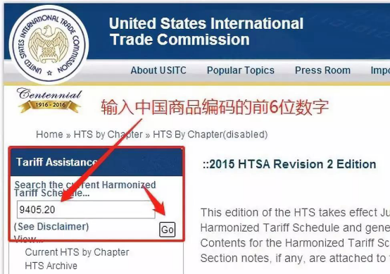 進入美國國際貿易委員會官網(http://www.usitc.gov/tata/hts/bychapter/index.htm),在TariffAssistance一欄的SearchthecurrentHarmonizedTariffSchedule...搜索框中輸入中國HSCODE的前六位數,如臺燈940520****。