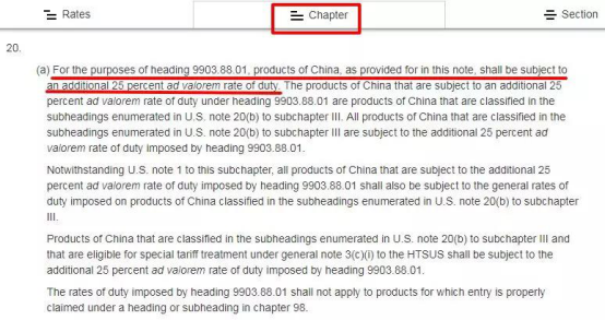至于上述的“note 20”是什么意思呢?我們可以在“Chapter”頁面下找到它,這里更詳細地解釋了:“note 20”是針對中國產品加稅的一個說明,25%是額外征收的稅率。