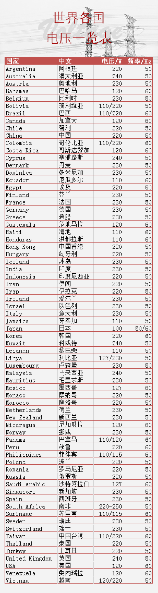 世界各國電壓及插頭型式一覽表
