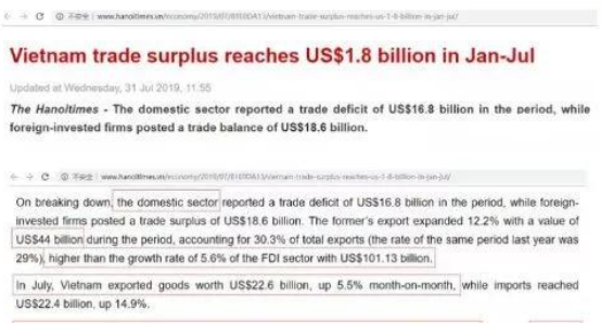 1-7月,美國為越南最大出口市場,越對美共計出口325億美元,同比暴漲25.4%;越南對歐盟出口243.2億美元,同比增0.4%;越南對華出口200億美元,同比增0.1%。