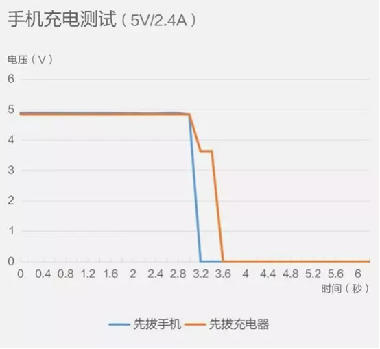 測試表明:[先拔充電器再拔手機],此時電壓出現明顯的波動,那是因為先拔充電器,部分殘留在充電器里的電壓還是會對手機造成影響。而[先拔手機再拔充電器],則不會出現此類情況。