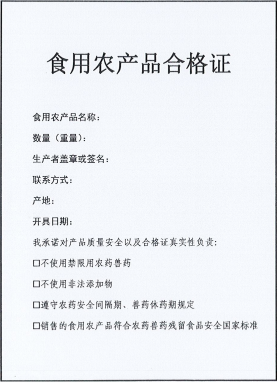 2019年12月,農業農村部印發《全國試行食用農產品合格證制度實施方案》的通知,決定在全國試行食用農產品合格證,守護“菜籃子安全”,讓消費者買得放心,吃得安心。