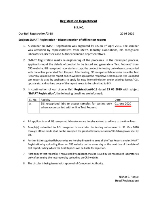 根據(jù)會(huì)議內(nèi)容,自2020年6月1日起,BIS將不再接受線下測(cè)試報(bào)告,所有測(cè)試均需在CRS網(wǎng)站上申請(qǐng),之后再由BIS認(rèn)可實(shí)驗(yàn)室測(cè)試,測(cè)試報(bào)告將直接上傳至CRS網(wǎng)站,無需再將測(cè)試報(bào)告副本提交給BIS。