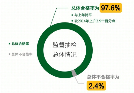 2019年,市場監(jiān)管總局完成完成國家食品安全監(jiān)督抽檢24.4萬批次,覆蓋33大類食品,檢驗(yàn)微生物、農(nóng)獸藥殘留、食品添加劑、生物毒素、重金屬等食品安全國家標(biāo)準(zhǔn)指標(biāo)558項(xiàng),檢出合格產(chǎn)品23.8萬批次,不合格產(chǎn)品5773批次。