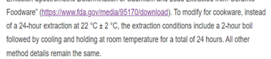 針對炊具產品,FDA提出測試條件應由“22℃±2℃下提取24小時”更新為“先煮沸2小時,然后冷卻并在室溫下保持22小時,測試時長共計24h”。