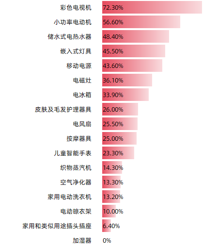《通報》涉及11種家用電器產品、3種電子產品、1種照明電器產品、1種電動機以及1種電器附件產品。不合格發現率分別為:
