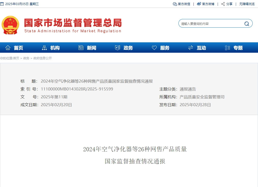 近期,市場監管總局組織空氣凈化器等26種網售產品質量國家監督抽查。現將抽查情況通報如下: