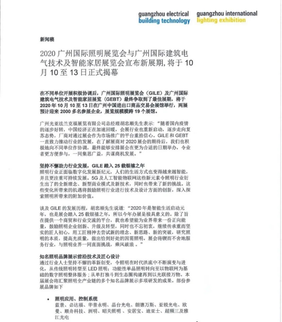 廣州國(guó)際照明展覽會(huì)(GILE)及廣州國(guó)際建筑電氣技術(shù)及智能家居展覽 (GEBT)新展期將定于2020年10月10至13日在廣州中國(guó)進(jìn)出口商品交易會(huì)展館舉行。