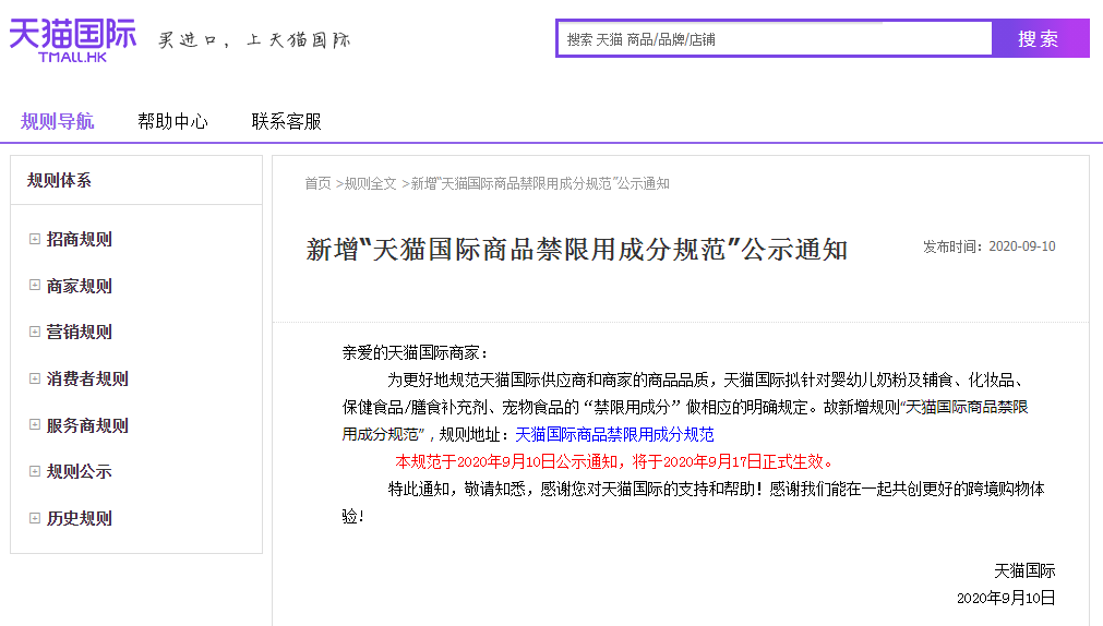 ?9月10日,天貓國際發布新增“天貓國際商品禁限用成分規范”公示通知(以下簡稱公告),擬針對化妝品等商品的“禁限用成分”進行相應的明確規定。本規范于2020年9月10日公示通知,于2020年9月17日正式生效。