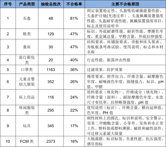 ● 不合格率高的產品類型包括:頭盔、鞋類、童床、口罩類、旅行箱包類、兒童及嬰幼兒服裝,休閑服裝類以及玩具