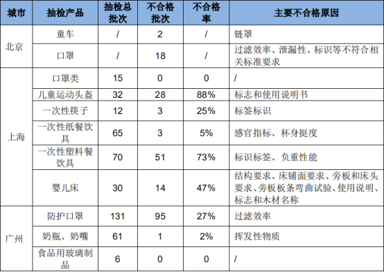 在收集到的北上廣深一線城市第三季度抽檢數據中,深圳未公布抽檢數據未納入分析。北京抽檢的產品主要為口罩類和童車,因只公布了抽檢不合格批次,未公布抽檢總批次,故數據同樣未納入統計中。