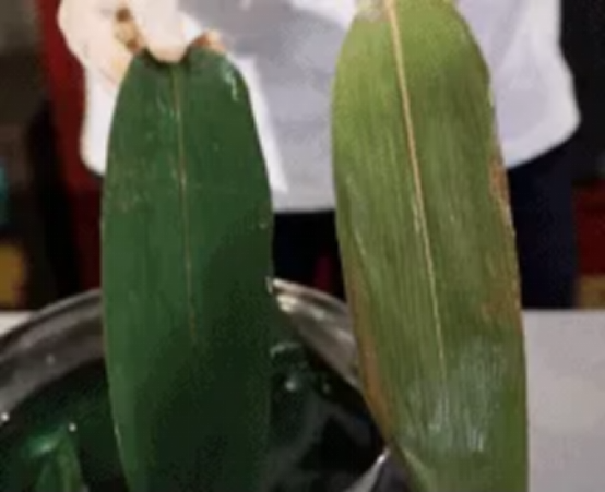 “返青粽葉”色澤青綠,看上去很漂亮,而正常粽葉在制作過程中經(jīng)過高溫蒸煮,顏色會發(fā)暗發(fā)黃。