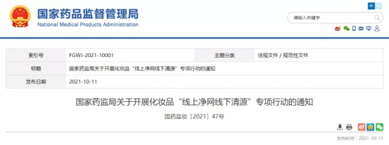 10月11日,國(guó)家藥品監(jiān)督管理局發(fā)布通知,決定自2021年10月至2022年10月,在全國(guó)范圍內(nèi)組織開展化妝品“線上凈網(wǎng)線下清源”專項(xiàng)行動(dòng)。自2019年以來,國(guó)家藥監(jiān)局已連續(xù)三年開展化妝品“線上凈網(wǎng)線下清源”專項(xiàng)行動(dòng)。