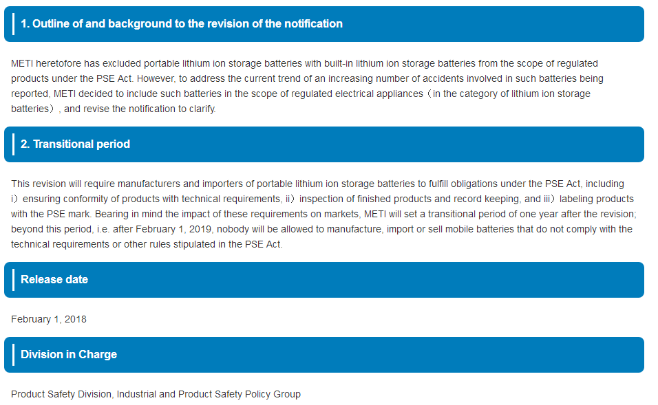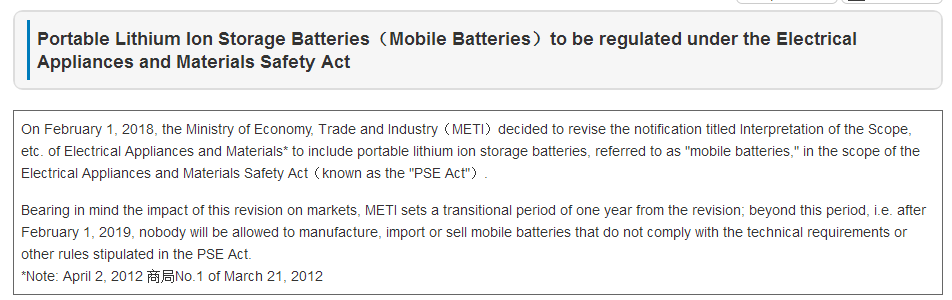 2018年2月1日,日本經濟產業省METI發布公告,針對圓形PSE管控對象的鋰電池范圍進行了內容修訂。新增便攜式電器的鋰電子電池和便攜式電池組為圓形PSE管控對象。