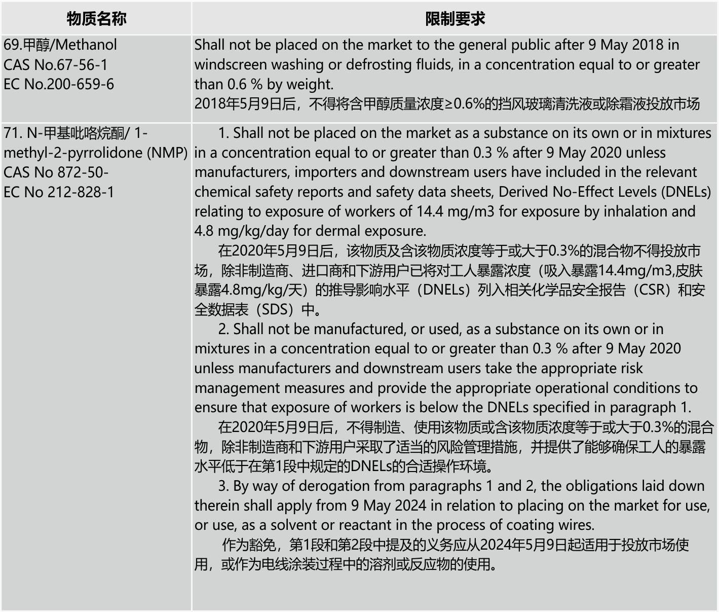 REACH附錄17限制物質(zhì)新增甲醇和NMP限制條款