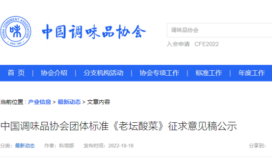 由中國調味品協會提出,并歸口的團體標準《老壇酸菜》形成標準征求意見稿(見附件1),現予以公示。各有關單位如有意見,請填寫標準征求意見表(見附件2),并于2022年11月20日前反饋至中國調味品協會團體標準技術委員會秘書處。
