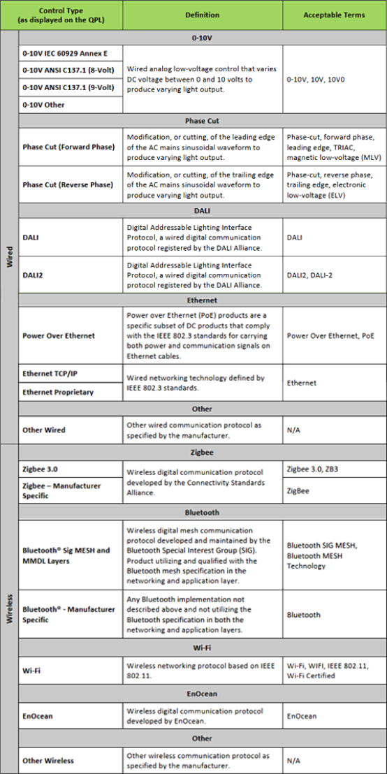 (2) 此外針對(duì)調(diào)光和控制功能、控制屬性、接受/傳輸硬件這些產(chǎn)品信息描述,DLC也要求提供相關(guān)的控制標(biāo)準(zhǔn)/協(xié)議(從下表中)。