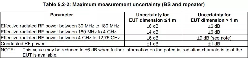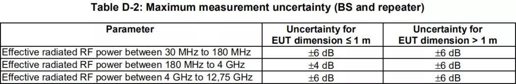 2) 新版本V13.1.1將要求最大測量不確定度的推薦值列表放到了附錄D,并對基站和中繼站的推薦值范圍進行了修改: