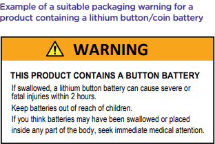d. 如果電池是鋰紐扣電池/硬幣電池,需要聲明:“如果電池被吞下或置于身體任何部位,可能在2小時或更短時間內造成嚴重或致命傷害”;