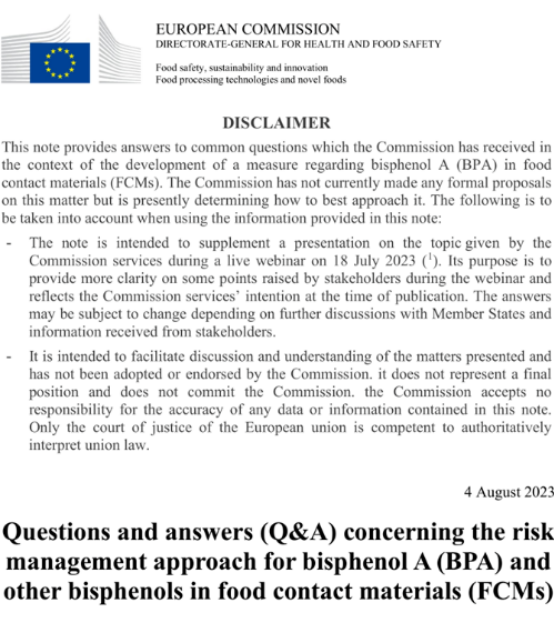 2023年8月4日,歐盟委員會發布了《食品接觸材料中雙酚A(BPA)和其他雙酚類物質風險管理方法的問答》,具體如下: