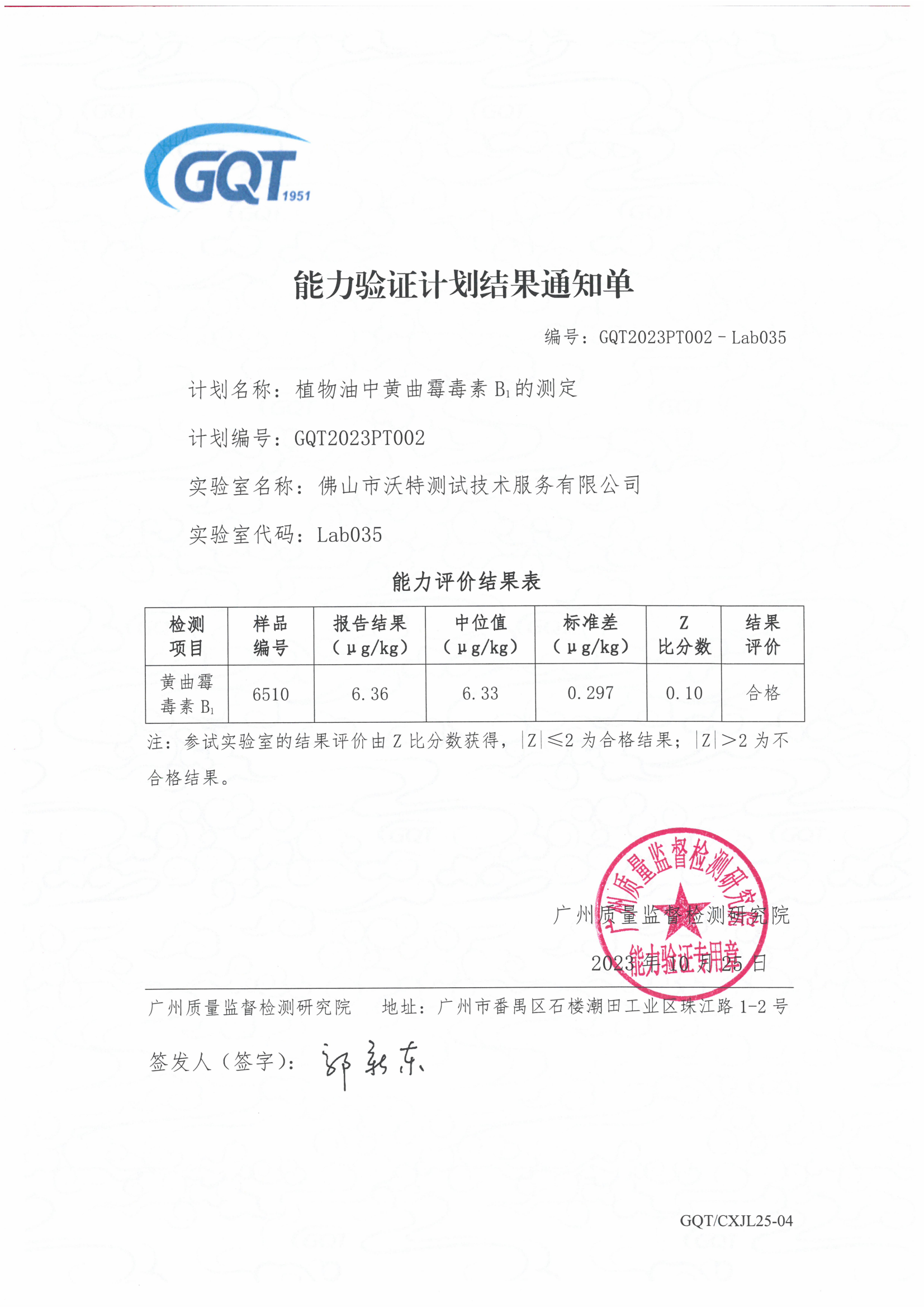 近日,佛山市沃特測試技術服務有限公司參加廣州質量監督檢測研究院組織的GQT2023PT001醬油中氨基酸態氮的測定、GQT2023PT002植物油中黃曲霉毒素B1的測定,能力評價結果為「合格」。