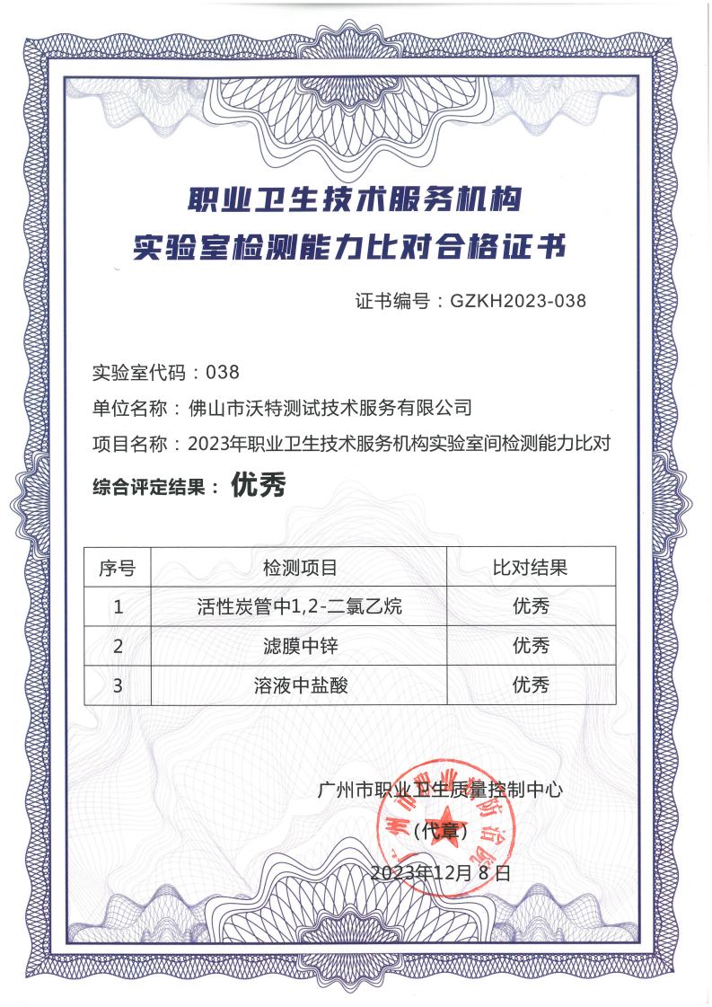 近日,沃特檢驗集團佛山公司收到了廣州市職業衛生質量控制中心關于“2023年職業衛生技術服務機構實驗室檢測能力比對”的反饋,綜合評定結果為“優秀”。本次能力驗證包含了活性炭管中1,2-二氯乙烷、濾膜中鋅、溶液中鹽酸的檢測項目,比對結果均為“優秀”。
