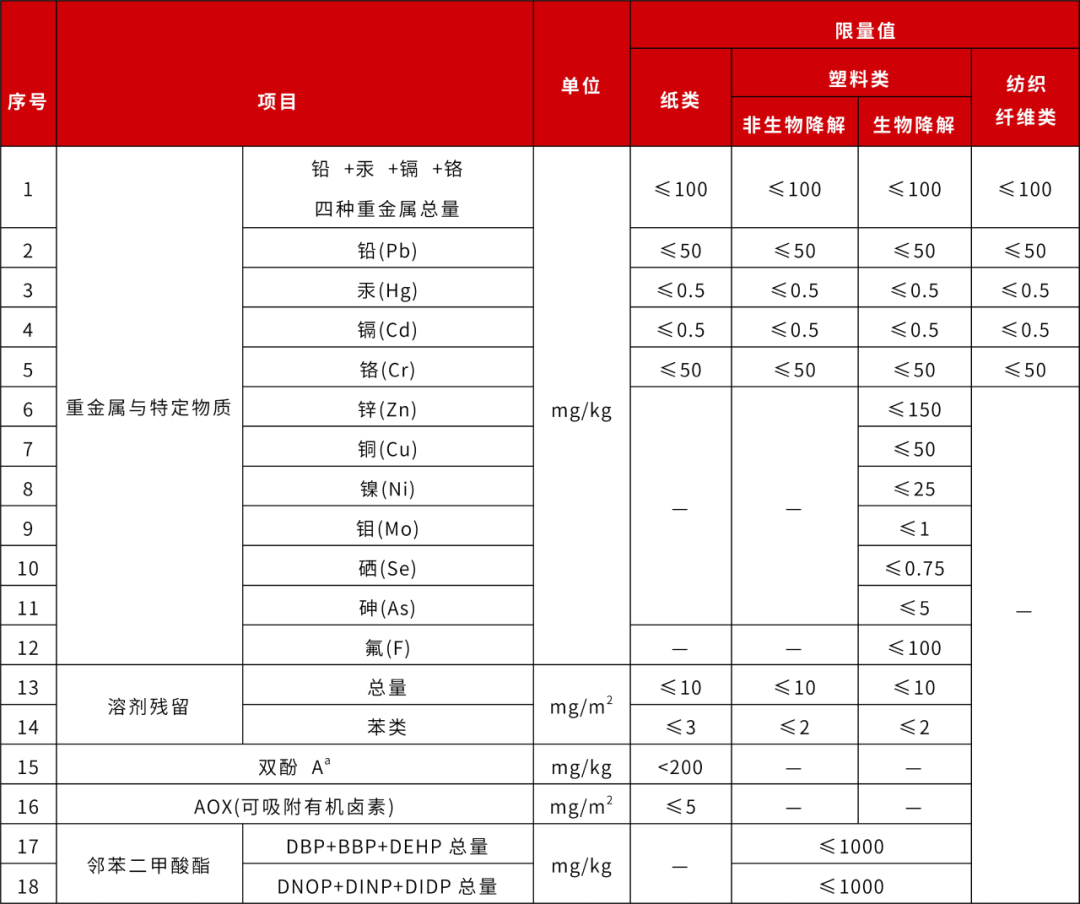 標準規定的紙類、塑料類和紡織纖維類快遞包裝中重金屬和特定物質限量要求如下表1所示。