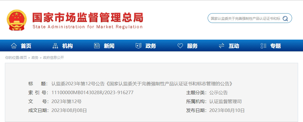 為深入貫徹黨的二十大精神,落實《國務院辦公廳關于加快推進電子證照擴大應用領域和全國互通互認的意見》(國辦發〔2022〕3號)關于拓展認證領域電子證照應用的要求,充分發揮市場在資源配置中的決定性作用,現將完善強制性產品認證(CCC認證)證書和標志管理有關措施和要求公告如下。