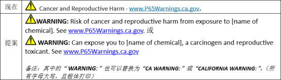 OEHHA規定了消費品的安全港(完整格式的)警告標簽和短格式的警告標簽,企業可以使用這些警告標簽來告知消費者接觸到加州65化學品清單上的化學品。其中的短格式警告標簽旨在用于小包裝或標簽上。目前的短格式警告標簽不要求在警告中展示具體的化學物質暴露。OEHHA注意到這種短格式警告標簽被過度使用。