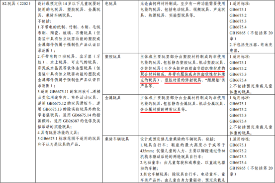 此外,根據(jù)該公告的附件《強(qiáng)制性產(chǎn)品認(rèn)證目錄描述與界定表(2020年修訂)》的第82項,玩具被劃分為電玩具、塑膠玩具、金屬玩具、乘騎車輛玩具4種產(chǎn)品,取消了“彈射玩具”和“娃娃玩具”這兩個類別。