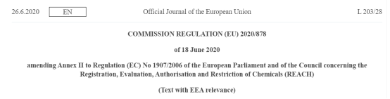 2020年6月26日,歐盟在其官方公報上發(fā)布(EU)2020/878修訂法規(guī),對 REACH法規(guī)【(EC) No 1907/2006】附件II關(guān)于編制安全數(shù)據(jù)表(SDS)的要求進行了更新。