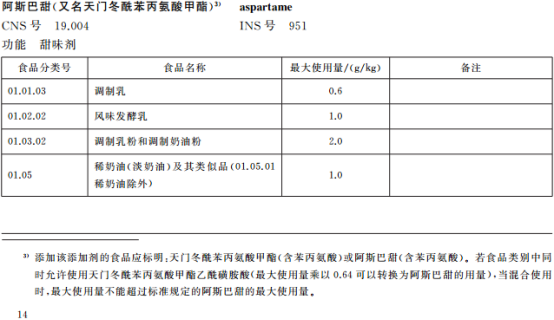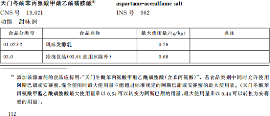 b) 若食品類別中同時允許使用天門冬酰苯丙氨酸甲酯乙酰磺胺酸和阿斯巴甜、安賽蜜,混合使用時最大使用量不能超過標準規定的阿斯巴甜、安賽蜜的最大使用量。(天門冬酰苯丙氨酸甲酯乙酰磺胺酸最大使用量乘以0.64可以轉換為阿斯巴甜的用量,最大使用量乘以0.44可以轉換為安賽蜜的用量)。