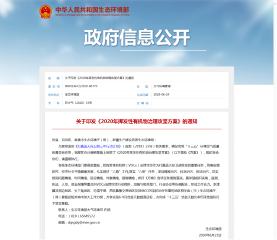 2020年6月23日,中國生態環境部官網公布關于印發《2020年揮發性有機物治理攻堅方案》的通知,要求揮發性有機物(VOCs)治理攻堅作為打贏藍天保衛戰收官的重要任務,確保完成“十三五”環境空氣質量改善目標任務。