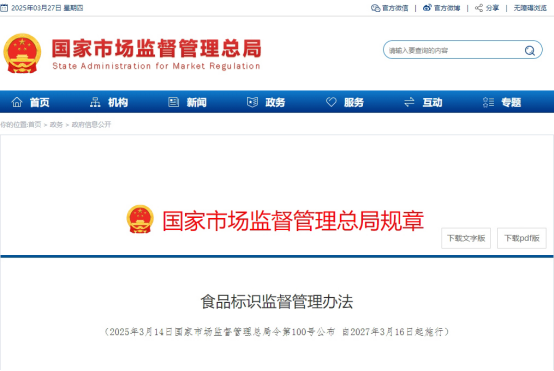 近日,市場監管總局制定出臺《食品標識監督管理辦法》(以下簡稱《標識辦法》),自2027年3月16日起將與新修訂的《食品安全國家標準 預包裝食品標簽通則》(GB 7718-2025)同步實施。