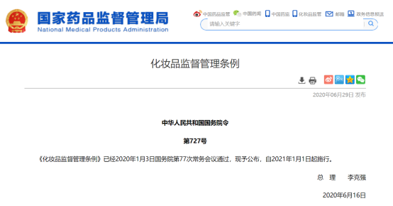 2020年6月29日晚,國務院官網發布了中華人民共和國國務院令第727號,《化妝品監督管理條例》正式頒布,自2021年1月1日起施行。