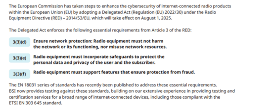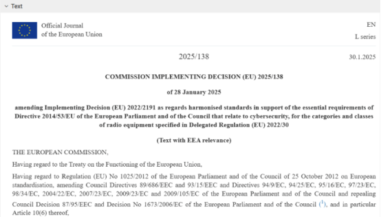 歐盟委員會于2022年發布了RED指令補充授權法案(EU) 2022/30,對無線電設備的網絡安全、隱私保護和反欺詐等方面提出了明確要求。針對RED中的網絡安全要求,歐盟于2024年8月發布EN 18031標準。2025年1月30日,歐盟委員會正式將EN 18031標準列入《歐盟官方公報》(OJ)的《無線電設備指令》(RED)協調標準清單。該法案將于2025年8月1日正式實施,屆時無線電設備必須符合RED指令第3(3)條(d)、(e)和(f)點的網絡信息安全要求才能進入歐盟市場銷售。