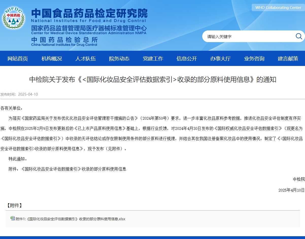 中檢院發布《<國際化妝品安全評估數據索引>收錄的部分原料使用信息》