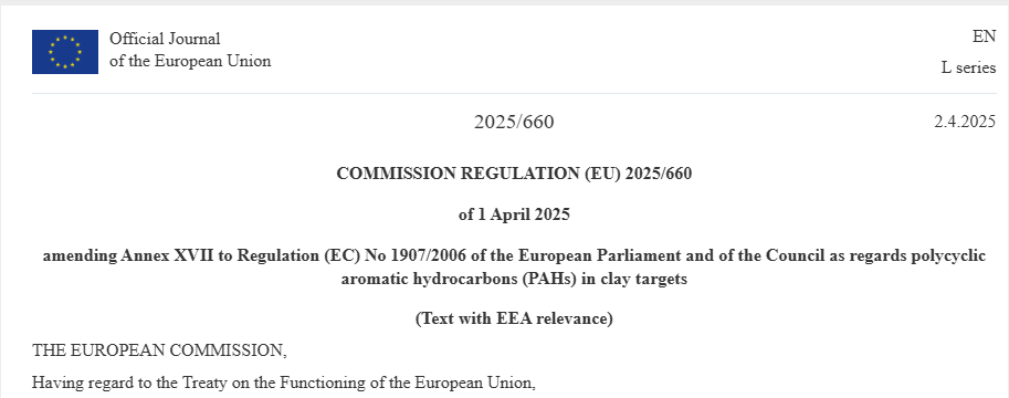 歐盟官方公報于2025年4月2日發布法規(EU) 2025/660,修訂REACH法規【(EC) No 1907/2006)】附錄XVII中關于粘土靶材中多環芳烴(PAHs)的規定。 本次修訂自歐盟官方公報上公布后的第二十天生效,即2025年4月21日開始生效。